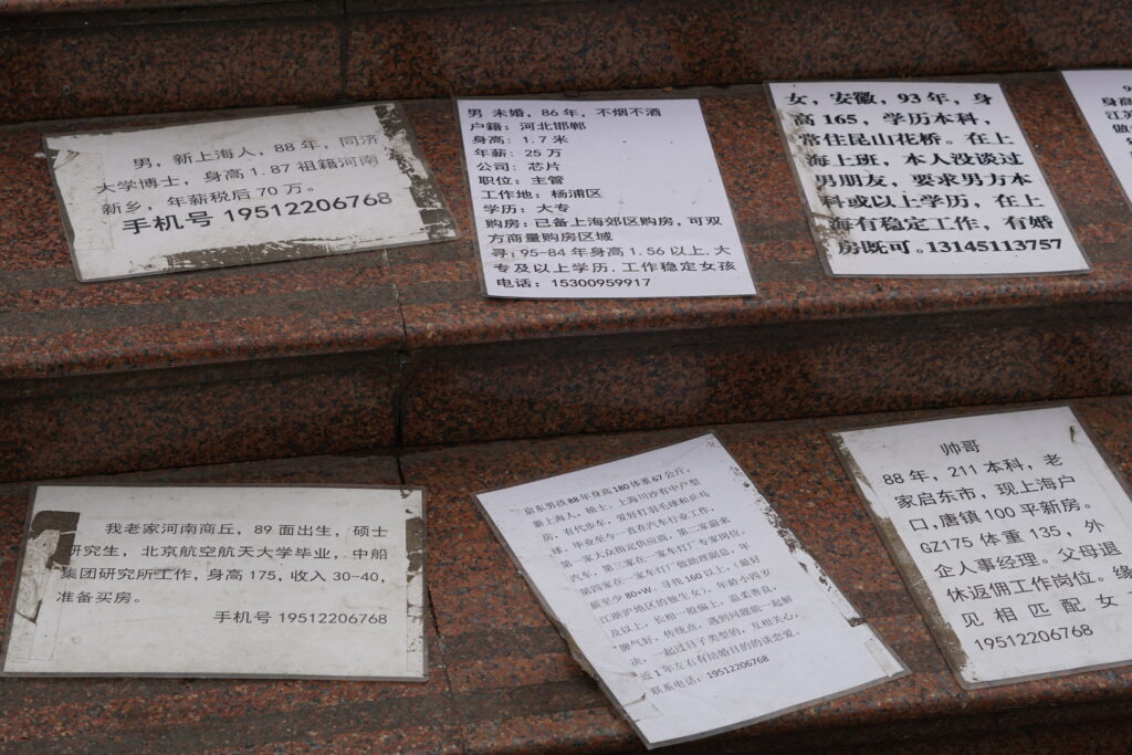 Ce sont des parents, parfois des grands-parents ou des amis de la famille, qui scrutent attentivement des morceaux de papier affichés sur des tableaux de fortune. Sur ces feuillets, des informations précises : âge, taille, niveau d’éducation, profession, salaire, possession d’un bien immobilier… Le marché matrimonial de Shanghai, ou plutôt comme les Chinois l’appelle « le coin des rencontres arrangées », est un lieu unique où les familles tentent de trouver un conjoint à leurs enfants.